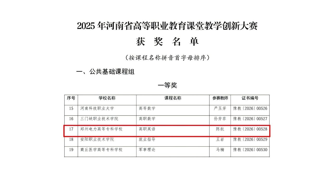 近日,河南省教育厅正式公布2025年河南省高等职业教育课堂教学创新大赛获奖名单,我校公共教学部陈航老师凭借深厚的教学功底、新颖的课程设计与出色的现场表现力,在全省各高职院校教学骨干的激烈角逐中脱颖而出,荣获公共基础组一等奖且以总成绩第一名的优异成绩登顶,充分彰显了我校公共基础教学的过硬师资实力与高质量育人水平。